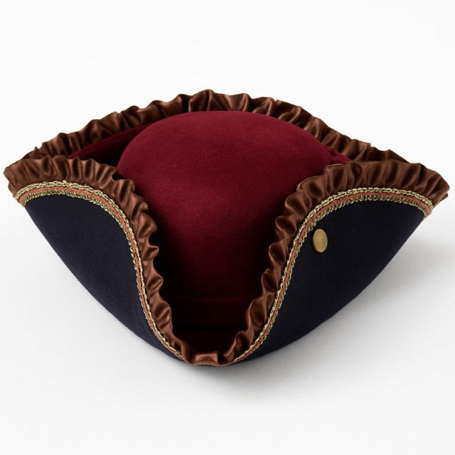 This Velvet Burgundy Pirate Tricorn Hat features plush burgundy velvet, brown ruffled trim, and gold accents for a luxurious pirate style. Perfect for Halloween, pirate parties, theatrical costumes, or nautical events, it adds elegance to any swashbuckler ensemble. Great for adventure and talk-like-a-pirate day.